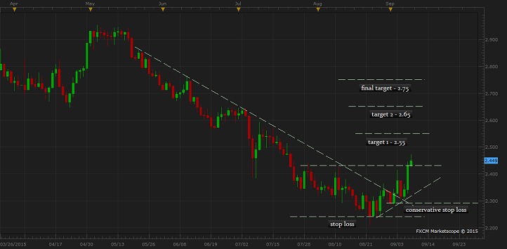 - Since the trade is against longer term fundamental, conservative traders might choose to use $2.29/pound area as stop loss.