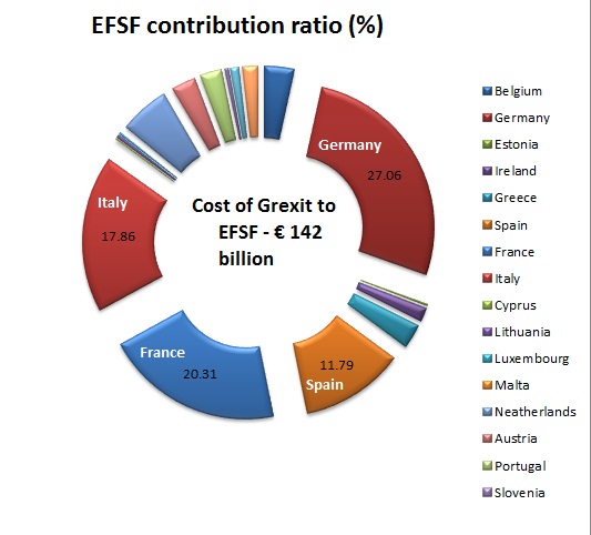 - Under the hypothetical situation of a Greek exit from Euro and default on the loans available, potential total cost to be the money given and forgone interest, which as of now stands at € 142 billion. Actual cost might differ depending on recoverable and asset sales.