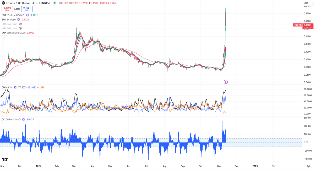 CROUSD surged more than 80% in the past two days. It holds above the short-term (21 and 55 EMA) and above the long-term moving average. It hit a high of $0.2325 and is currently trading around $0.1904.