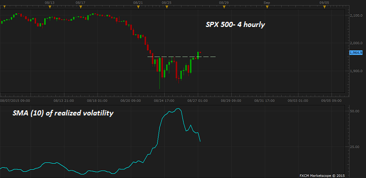 With improvement in sentiment, volatility is subsiding steadily. The chart shows 10 period average of realized volatility in S&P500's 4 hourly chart, which reached as high as 50 points or around 2.5%. As of now it has dropped sharply to just about 28 points.