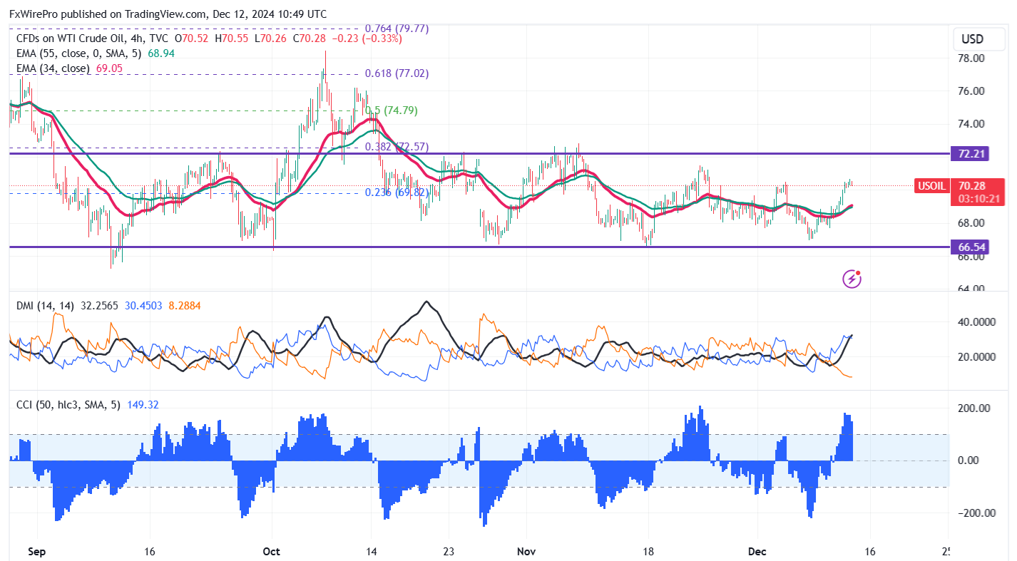 Crude oil faces significant resistance at $70.80; breaking above this level could lead to prices rising to $71.45 or even $72.60. Conversely, if prices fall below the near-term support of around $70, targets could drop to $69, $68, $67, or lower. Current market indicators suggest a bullish trend. A suggested trading strategy involves buying on dips around $70 with a stop-loss of around $69 for a target price of $72.50.