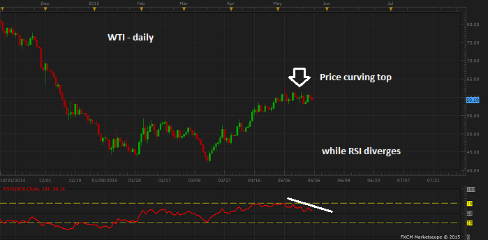 - Series of bearish doji, both in daily and weekly chart posing doubts on bulls' ability to push forward. Now Crude price is curving a top in daily chart with RSI indicating that bulls' might be losing strength.