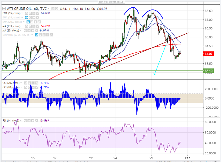 - Technically, the pair has formed a double top around $66.63 and any major bullishness can be seen only above that level. Minor bullishness can be seen above $64.40 (hourly Kijun-Sen) and any break above will take the commodity to next level till $65/65.60.