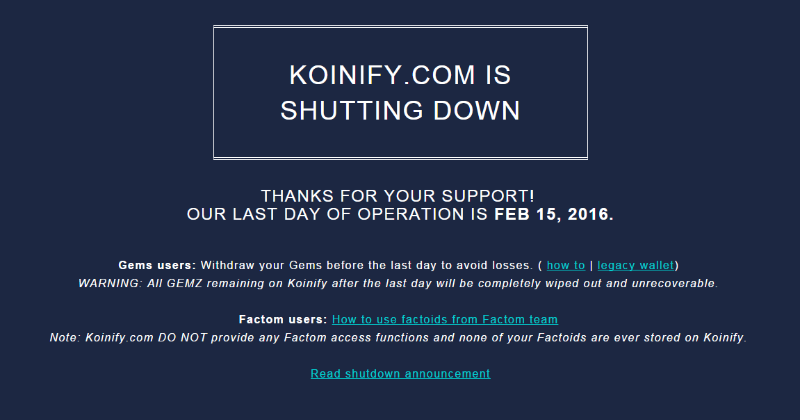 The homepage of the website now displays the shutdown message and recommends users to withdraw their Gems before the last day to avoid losses. The page also said that Factoids were never stored on Koinify and it does not provide any Factom access functions.