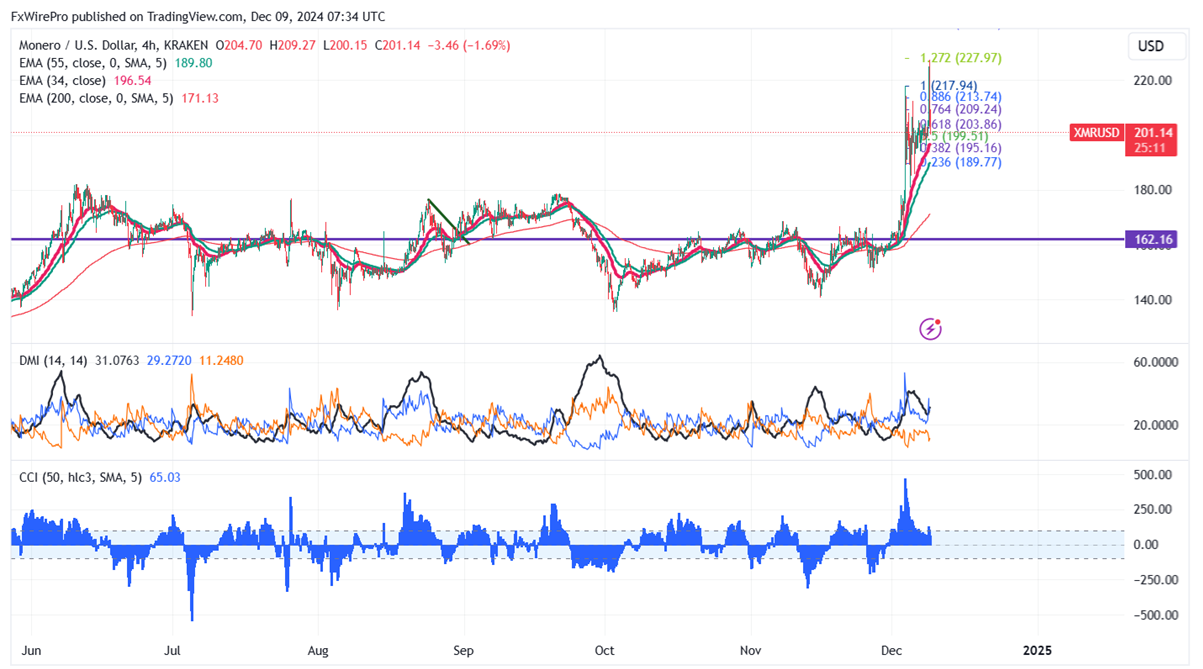 XMRUSD performed well in the past two days. Any daily close above $230 confirms further bullishness. XMRUSD gained more than 50% in the past ten days. The pair holds well above the short-term (34 and 55 EMA) and long-term moving average. It hit a high of $224.94 and is currently trading around $201.