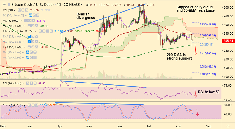 Bitcoin Cash has bounced off 200-DMA support on Thursday, bias remains bearish.