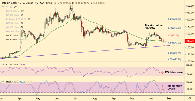 BCH/USD has broken below strong supports at 2H 400 SMA and 50-DMA and is currently hovering around 61.8% Fib at 234.03.