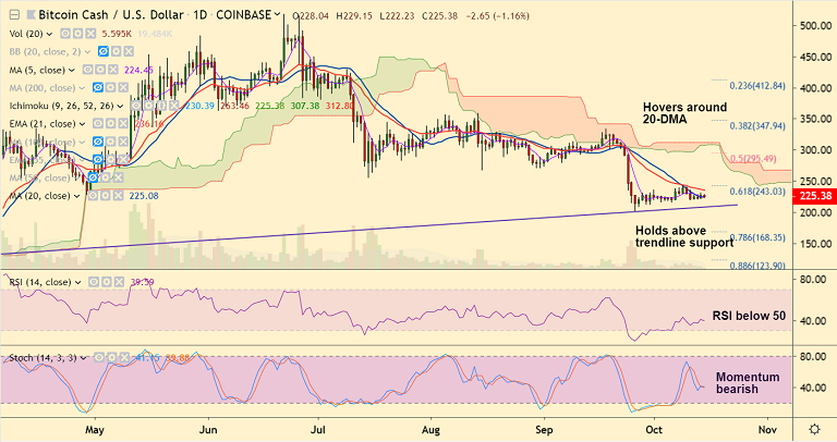 BCH/USD was trading at 225.56 on the day, down 1.06% at 11:00 GMT.