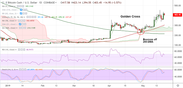 BCH/USD trades 3.44% lower at 403.79 at 12:20 GMT