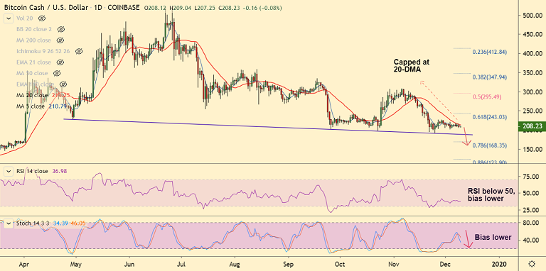 BCH/USD was trading 0.54% lower at 207.27 at 08:30 GMT, after closing 2.03% lower in the previous session.