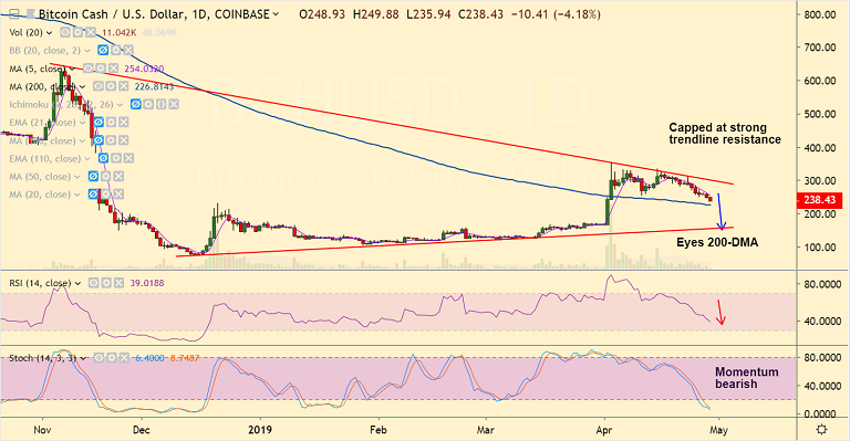 - BCH/USD is extending grind lower along downward sloping 5-DMA