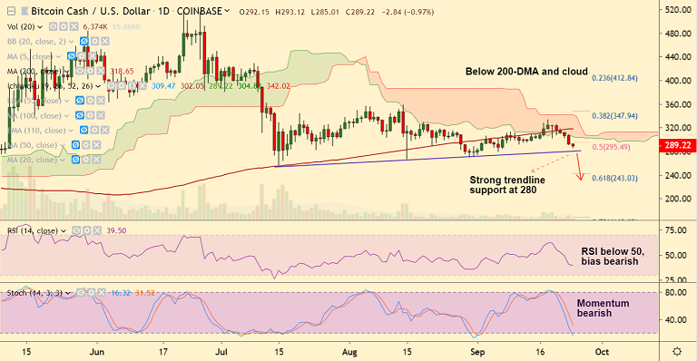 BCH/USD extends weakness for the 5th straight session, hits 3-week lows at 285.01.