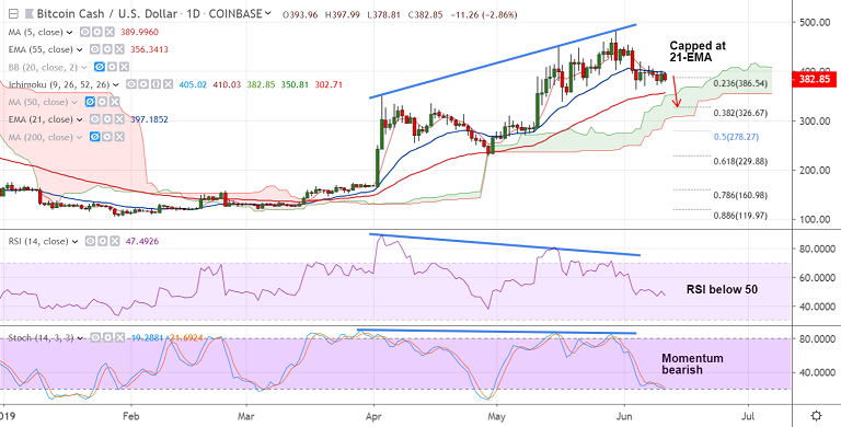 Bitcoin Cash extends sideways grind, upside capped at 21-EMA at 397.17.