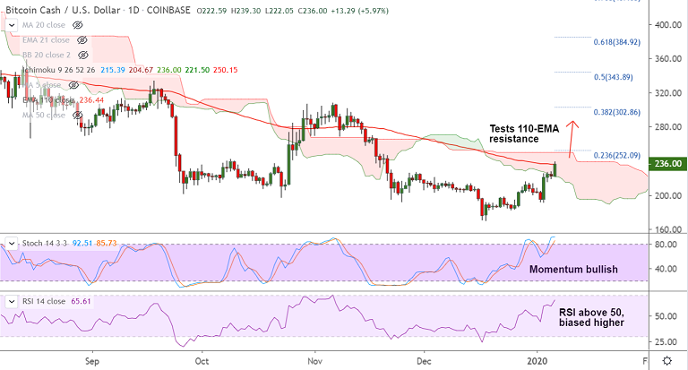BCH/USD spikes around 6% on the day to hit 7-week high at 239.30, bias bullish.
