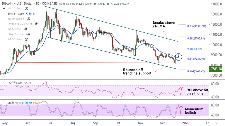 BTC/USD was trading 1.15% higher at 7597 at 04:00 GMT, intraday bias has turned bullish.