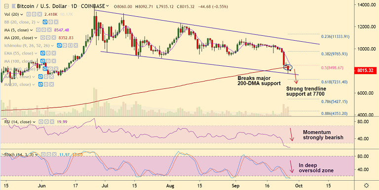 Bitcoin has breached crucial 200-DMA support to close below on Thursday's trade.