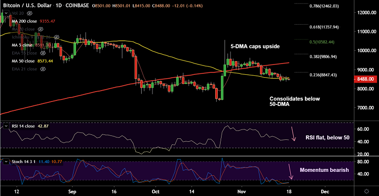 BTC/USD is consolidating break below 50-DMA, upside capped below $8500 mark, bias bearish.