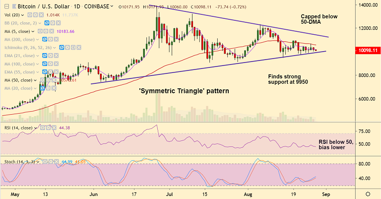 The pair trades in a 'Symmetric Triangle' pattern, finds strong support at 9950 (Triangle base).