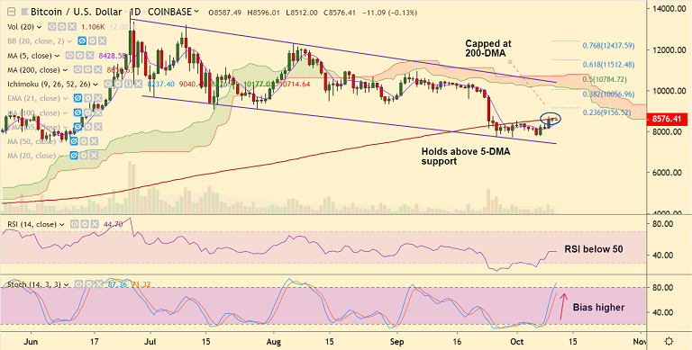 BTC/USD is struggling to break past 200-DMA which is stiff resistance at 8656.
