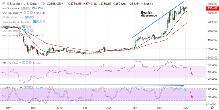 'Bearish divergence' seen on RSI and stochs which adds to the downside bias.