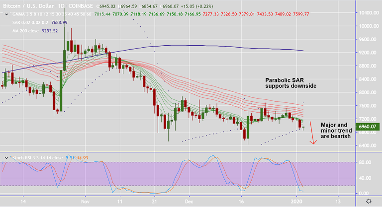 Major and minor trend are bearish as evidenced by the GMMA indicator. Further, the parabolic SAR now supports downside.