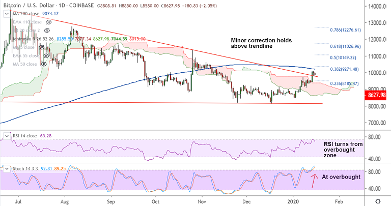 BTC/USD is showing a minor correction as oscillators correct from overbought levels.