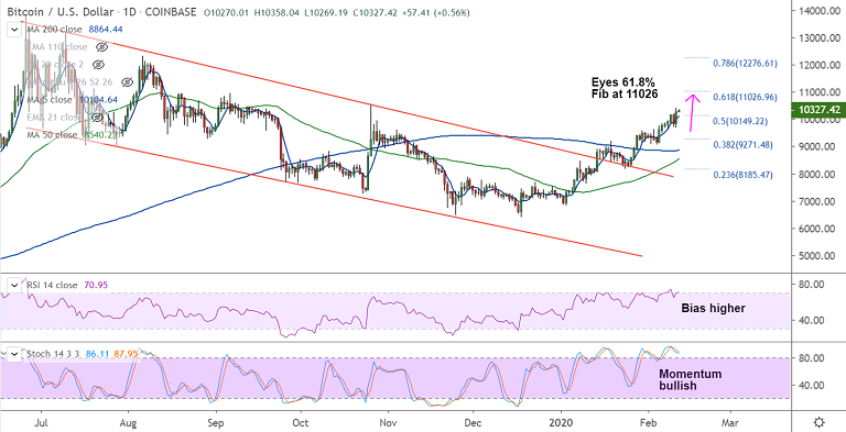 BTC/USD is extending bullish momentum, was trading 0.48% higher on the day at 10315 at around 09:40 GMT. After a brief pause on Monday's trade, the pair surged higher on Tuesday to close 4.25% higher at 10270.
