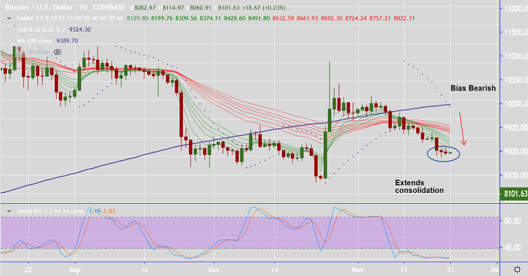 BTC/USD is extending consolidation for the 3rd consecutive session, holds above 55W EMA support at 7951.