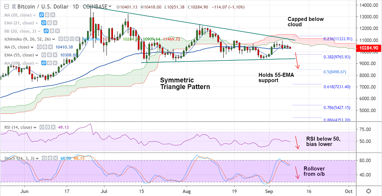 BTC/USD is extending sideways grind along 55-EMA support, scope for downside resumption.