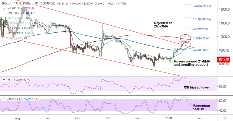 Price action has trimmed losses and is currently hovering around 21-EMA and channel top support at 8300.