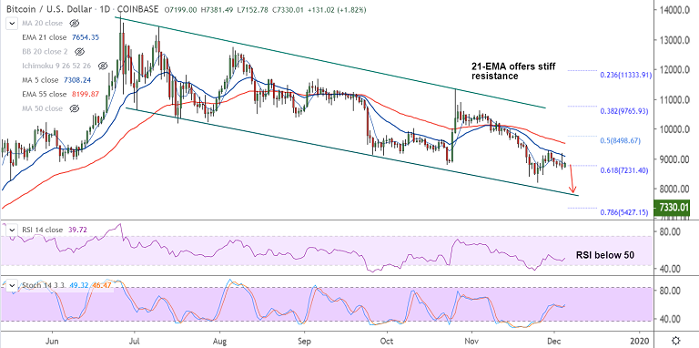 Major trend in the pair is bearish and near-term bias also remains bearish as long as 21-EMA resistance (7650) holds.