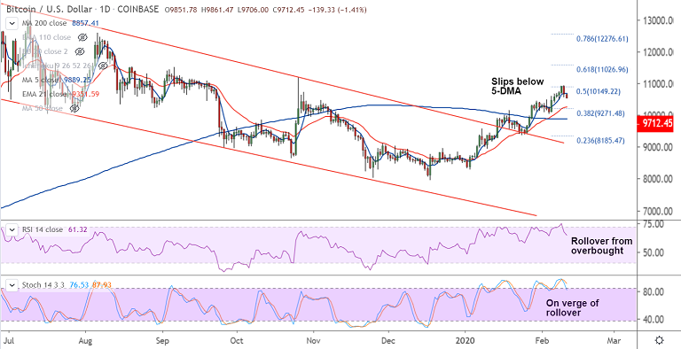 Price action has slipped below 5-DMA and is now close to major support at 200H MA at 9649.