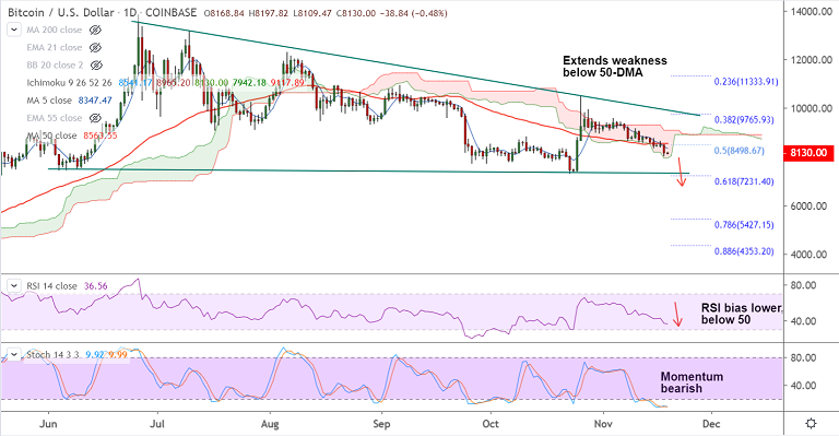 The pair is extending break below 50-DMA, dip till 55W EMA at 7964 likely. Further weakness only on break below.
