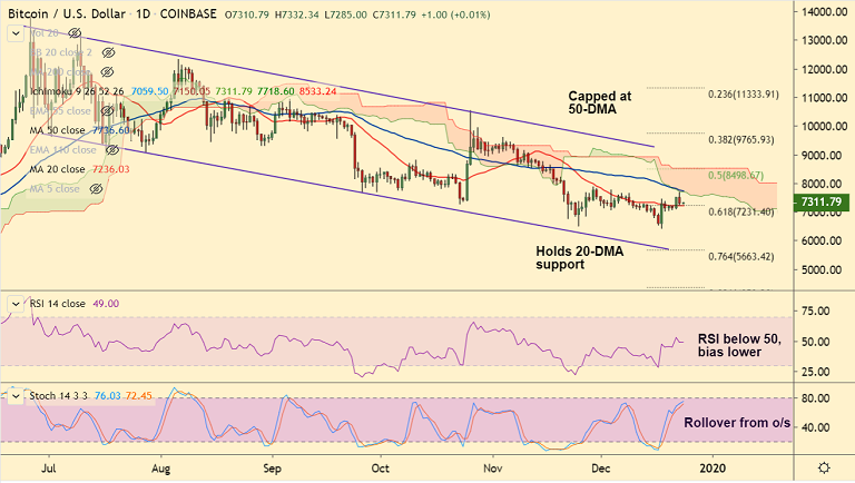 The pair is holding support at 20-DMA (7235) and weakness only on break below.