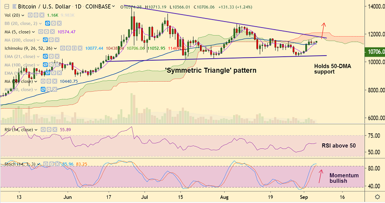 BTC/USD trades 1.35% higher on the day at 10712 at 03:15 GMT, bias is turning slightly bullish.