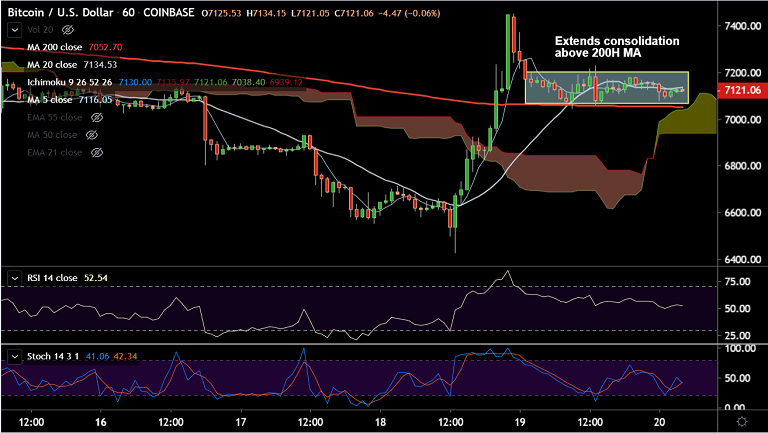BTC/USD has been extending sideways above 200H MA support (currently at 7052).