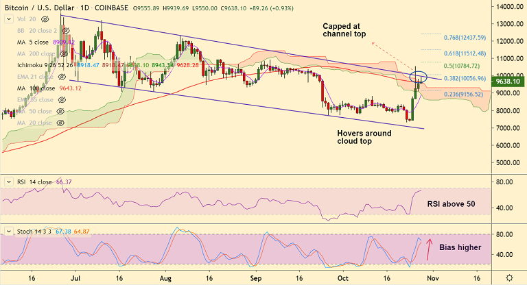BTC/USD has edged lower from session highs at 9939, hovers around daily cloud.