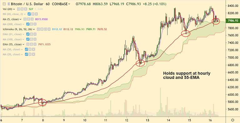 Support: 7970 (1H 55-EMA); Resistance: 8488 (July 2018 high)