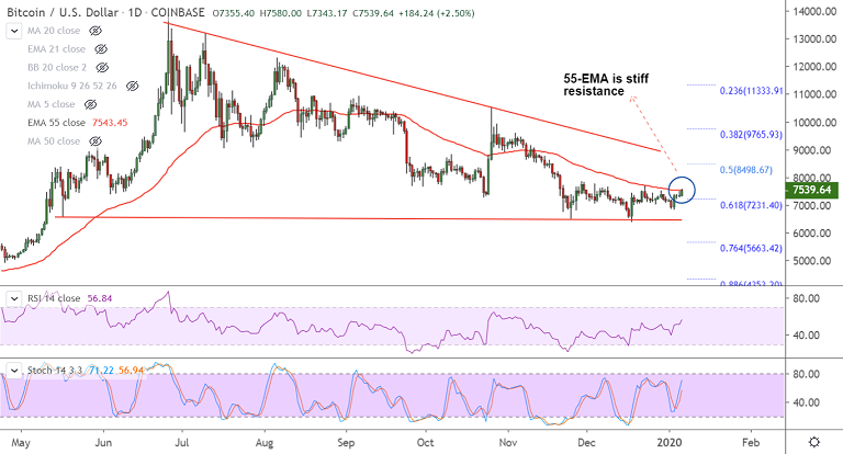 Price action is pivotal at 55-EMA resistance at 7543, decisive break above could buoy near-term bulls.