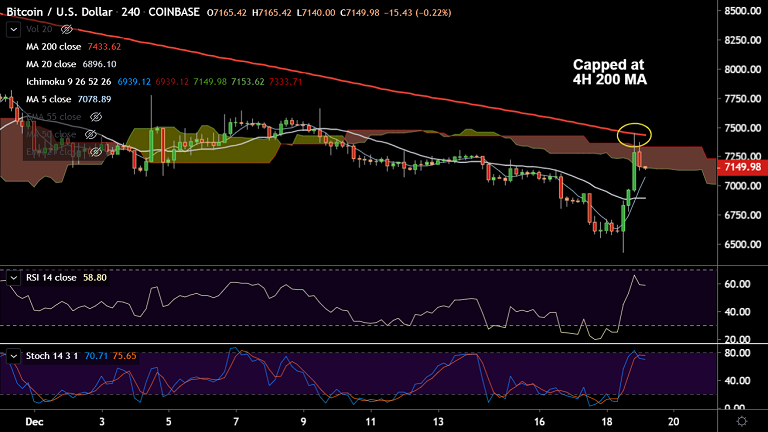 The pair finds stiff resistance at 4H 200 MA. Break above could see gains till 55-EMA at 7794.