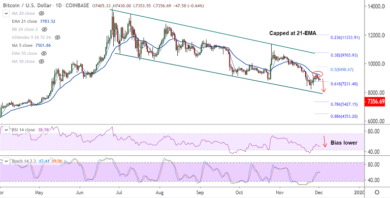Major trend has been bearish and rejection at 21-EMA will likely see downside resumption.