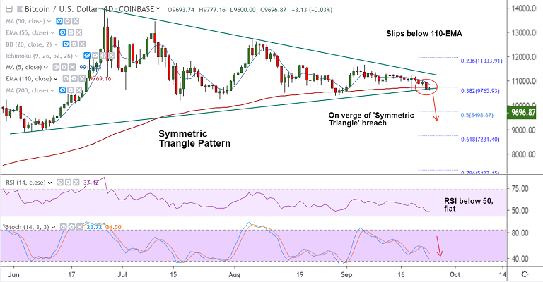BTC/USD slips below 110-EMA, tests triangle base support at 9630, bias is bearish.