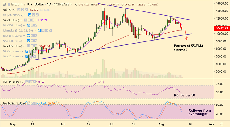 BTC/USD has slipped below daily cloud, scope for further weakness as technical indicators are turning bearish.