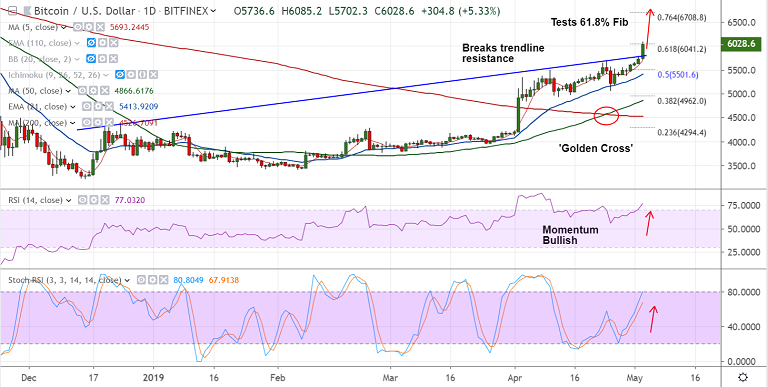- BTC/USD takes out 6000 mark, tests 61.8% Fib at 6041, bias bullish
