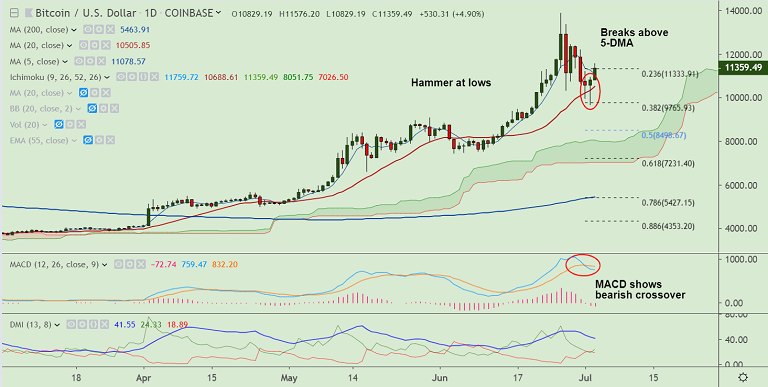 BTC/USD extends retrace above 11,000 mark, breaks above 5-DMA.