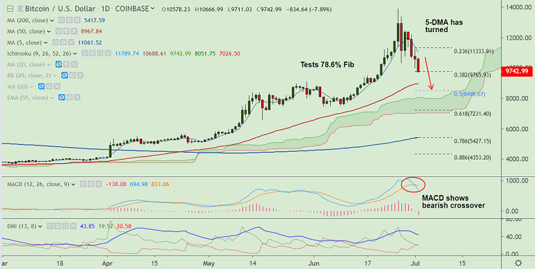 BTC/USD extends weakness below $10,000 mark, hits new 2-week lows at 9733.