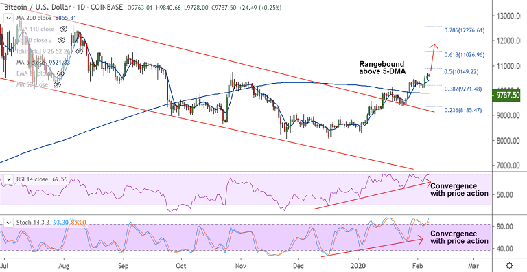 BTC/USD was trading rangebound on the day at 9775 at around 07:55 GMT, bias remains bullish.