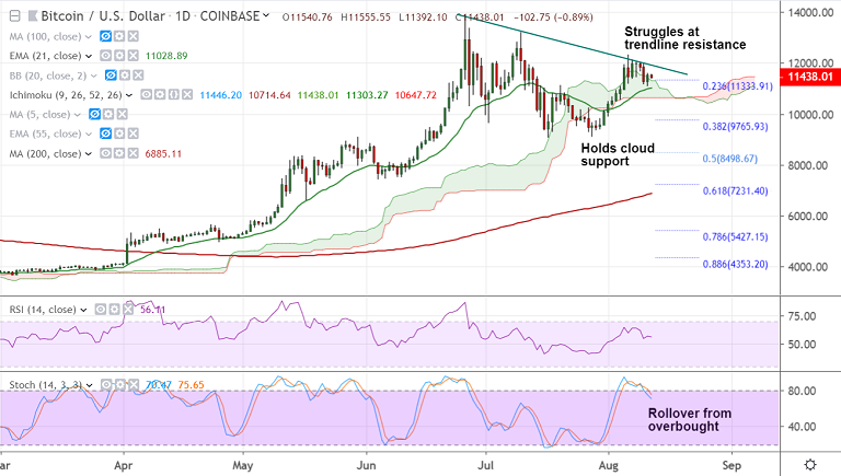 BTC/USD opens Monday's trade on a weaker note. Trades 0.75% lower at 11454 at 04:30 GMT.