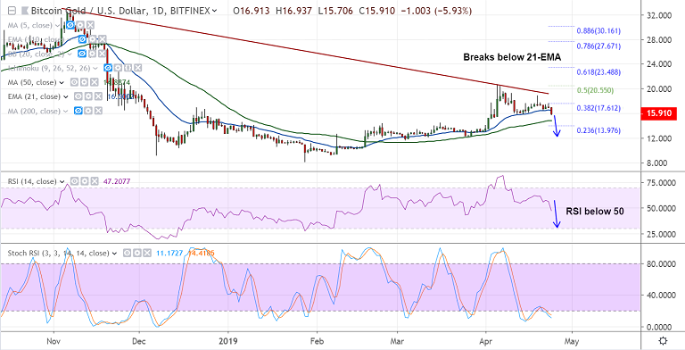 - BTG/USD slips below 21-EMA support, bias brearish