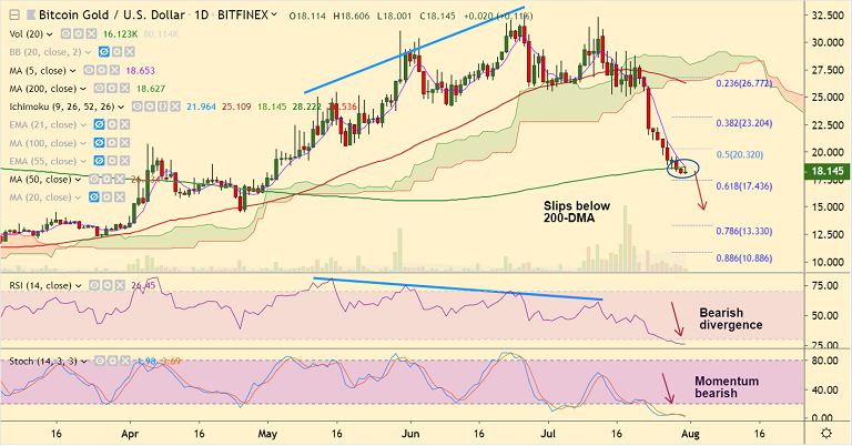 BTG/USD is extending weakness below 200-DMA, eyes 61.8% Fib retracement at 17.43.